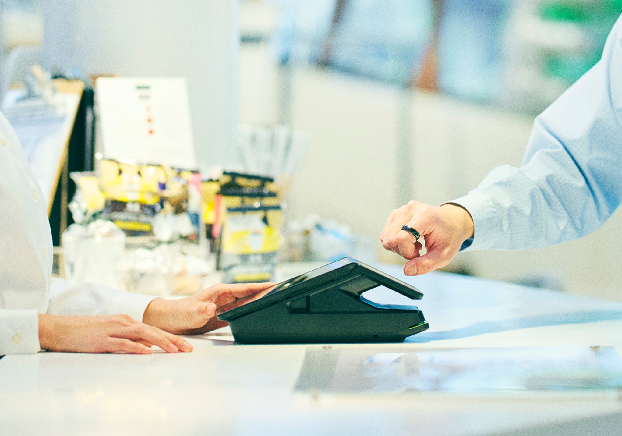 EVERINGは、レジ端末にかざしたときにリーダーからの電波に反応して決済されるため、充電が必要ありません。
